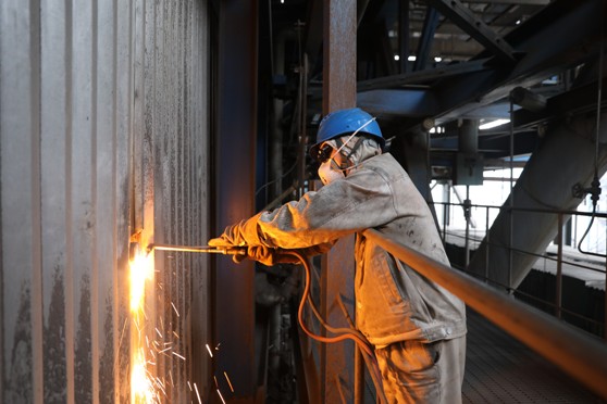 我顺着楼梯下到四楼,突然眼前一片红光,原来是检修人员正在进行焊割工作。“我正在操作的是炉膛短吹切割,这项工作主要是为了把在炉膛内搭架子的钢管固定好。一共要气割20来个,现在已经完成10个左右,我今晚会加班完成所有气割工作。”热机部锅炉本体检修班的肖俊说完,便继续开始手中的工作。