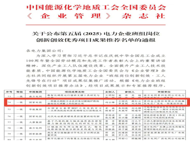 本网讯 近日,纳雍电厂申报的《一种激光测距方法在四角切圆锅炉燃烧器组优化调整》项目,在中国能源化学地质工会全国委员会第五届电力企业班组岗位创新创效优秀项目成果评选中,荣获一级优秀项目荣誉。