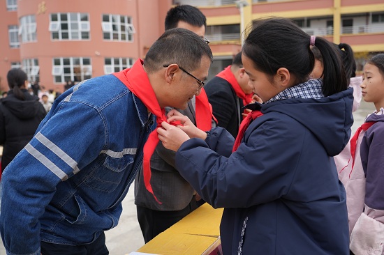 捐赠仪式上,少先队员代表为到场领导及志愿者佩戴红领巾,用真挚的敬意拉开活动序幕。学生们以诗朗诵的形式,深情表达对黔北电厂的感恩之情,更立下勤学奋进、报效社会的青春誓言,现场氛围温馨而热烈。