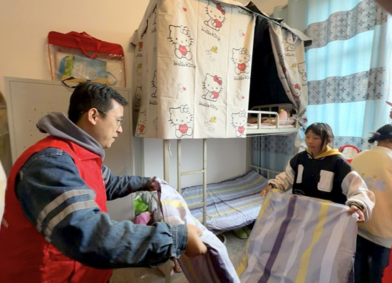 活动现场暖意融融,志愿者们将精心采购的床上用品逐一递到同学们手中。并走进学生宿舍,手把手教孩子们叠被子、铺床单,细心为他们换上崭新床品,将柔软与温暖层层铺进床铺。“这个床单摸起来好软呀,谢谢叔叔阿姨!”一名小学生捧着新床品,脸上绽放出比冬日暖阳更灿烂的笑容。志愿者们与同学们亲切交流,询问其近期学习和生活情况,鼓励他们要胸怀理想、立志成才,学会感恩、回报社会。