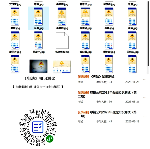 为检验学习成效、巩固知识储备,绿链公司从内部自主组织与集团统一参与两个维度开展宪法知识测试。内部层面,梳理宪法基本理论、宪法宣誓、修订历程、公民权利与义务等核心知识点,编制专属题库,设置选择、判断两类题型,通过随机抽题的线上答题模式,吸引33人次参与,以灵活便捷的形式加深员工对宪法条款的理解记忆。集团层面,积极组织员工通过“电投e”平台参与集团公司宪法知识测试,全体人员踊跃响应、认真作答,充分展现了对宪法的尊崇和对合规学习的重视。