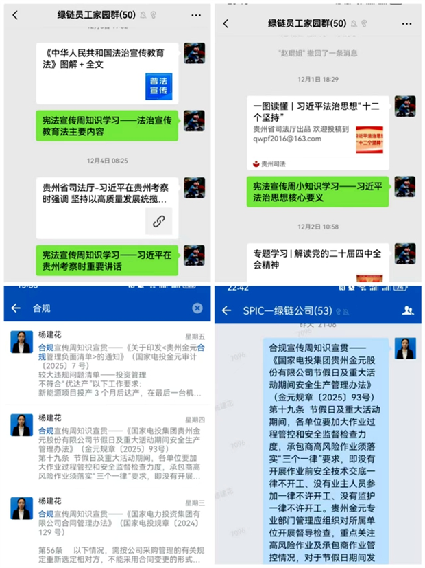 为让合规知识随时随地可学可感,绿链公司充分利用微信工作群、电投壹工作群等线上渠道,开展每日合规知识点推送活动,累计推送10期内容。“宪法宣传周”期间,聚焦习近平法治思想核心要义、党的二十届四中全会精神、法治宣传教育法重点、习近平总书记在贵州考察时重要讲话精神及全民普法成效等内容。“合规宣传周”则围绕采购管理、规章制度管理、合同管理、节假日安全生产管理、贵州金元合规负面清单等业务关键领域,提炼核心条款、梳理风险要点,以精简精炼的内容实现“短平快”学习,让学法、懂法、用法成为员工的自觉行动。