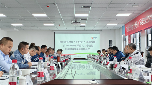 本网讯 9月23日,贵州金元在织金清洁能源公司现场组织召开国家电投贵州金元织金“上大压小”异地改建项目(2×660兆瓦)1、2号机组启动验收委员会末次会议。与会领导及专家赴生产现场及智慧展厅等区域参观并检查。启委会主任委员、贵州金元党委副书记、总经理朱仕祥出席会议并讲话,启委会副主任委员、贵州金元党委委员、副总经理瞿进主持会议。