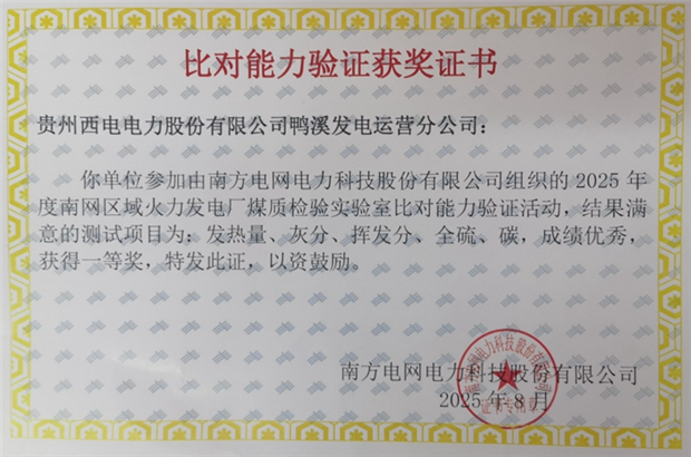 本网讯 近日,从南方电网传来捷报,鸭溪运营参加2025年度南网区域火力发电厂煤质检验实验室比对能力验证活动,在众多参赛单位中脱颖而出,荣获一等奖。
