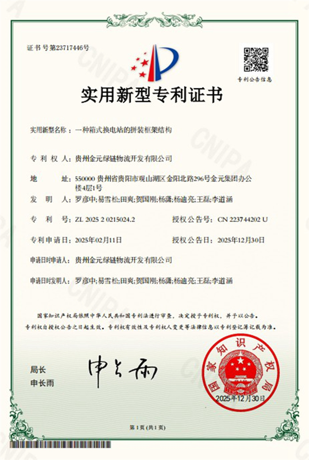 本网讯 近日,国家知识产权局传来喜讯,由绿链公司自主研发的“一种箱式换电站的拼装框架结构”成功通过审查,正式被授予国家实用新型专利权(专利号:ZL202520215024.2)。这一创新成果的落地,是绿链公司立足绿电交通产业发展需求,以技术创新破解项目建设痛点的重要突破,为充换电站规模化布局提供了有力技术支撑。