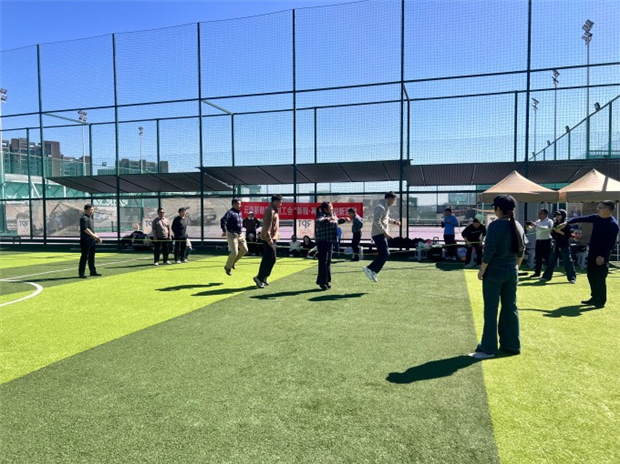 跳大绳项目将活动推向又一个高潮。长绳在空中划出优美弧线,队员们依次鱼贯而入,跳跃、腾空、落地,动作行云流水。偶有失误绊绳,大家也不气馁,相视一笑迅速调整节奏。两根绳索,串起的是默契配合,传递的是同频共振的团队信念。