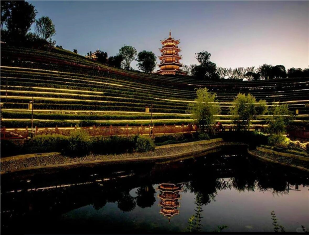 待到暮色四合,梯田便换上了璀璨的晚装。暖黄灯带沿着田埂蜿蜒,将“大地指纹”勾勒得愈发清晰,山顶的塔楼在灯光中熠熠生辉,倒影在下方的池塘里,与漫天暮色晕染成一幅绝美的夜景图。晚风轻拂,带着草木与花香的气息,耳边是隐约的彝族歌谣,让人忍不住放慢脚步,沉醉在这乌蒙山下的温柔夜色里。