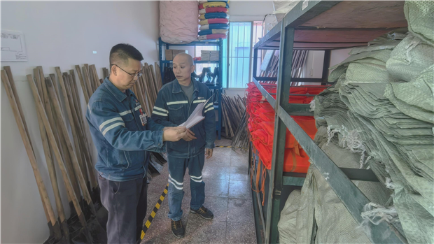 检查期间,韩学波深入生产现场、沙坝河水库、灰场等重点区域,实地细致排查现场安全隐患,逐一核查应急物资储备数量、台账规范情况及调用流程合理性。他在现场强调:“防汛物资必须做到账实相符、管理精细、随时可用,关键时刻要顶得上、靠得住,切实发挥应急保障作用!”同时,黔西电厂依托“工业互联网+安全生产”智能平台,实现隐患“发现——派单——整改——验收”全流程线上闭环管理,推动安全管理工作向数字化、精细化水平跃升。